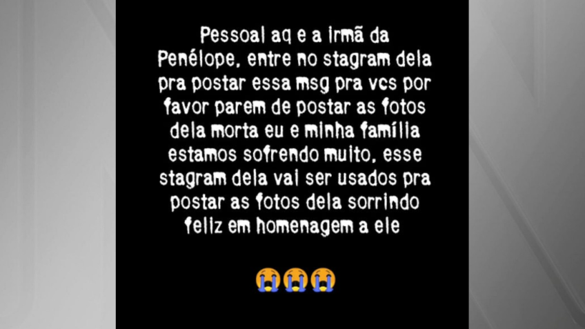 “Pessoal, aqui é a irmã da Penélope. Entrem no Instagram dela pra postar essa mensagem, por favor parem de postar as fotos dela morta, eu e minha família estamos sofrendo muito”, escreveu a irmã em tom de desabafo.